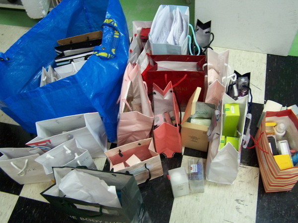 這是奧麗薇扛來還要扛回家的產品,很重很重真的很重,因為很多瓶瓶罐罐的東西,有時會背到肩膀瘀青,但這IKEA的袋子好好用喔!最近奧麗薇家前面說要變成徒步區,如果以後背這些東西還不能坐小黃到自家門口,我一定會跟小黃的司機一起爆走!衝過警戒線。