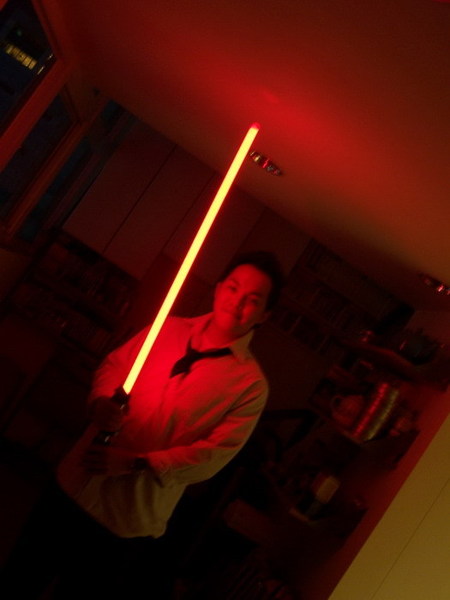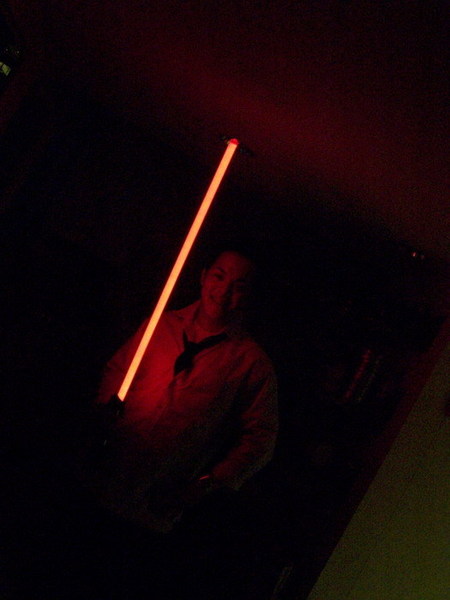 「妳廚房的燈在哪?」「疑!在牆上!幹麻呀!」接著有人就拿出今天敗的光劍上場!!!!但是我覺得超正的呀!而且這光劍還會發出電影中的那種光束聲音喔!馬上幫他拍下來吧!一張是用較短的快門時間。但我喜歡這一張,比較有Fu~。