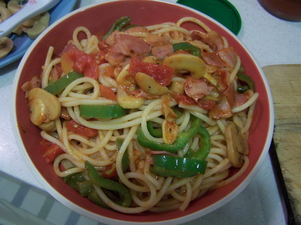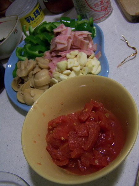 七點肚子有點餓囉!拿波里義大麵是一道將全部的材料切一切下鍋炒一炒就可以完成的料理,超簡單啦!有青椒、培根、罐頭洋菇跟很多很多很多的蒜頭,我愛!當然重點還要有切丁的蕃茄粒(罐頭),不要用新鮮的蕃茄喔!Fu很不一樣。