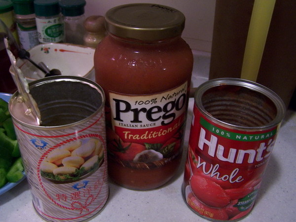 然後今天用的罐頭有這些!我最愛的Hunt’s(漢斯)蕃茄粒罐頭,因為這牌子的蕃茄粒都不會爛爛的,另外中間的義大利麵醬其實也是Hunt’s的,只是用Prego的罐子,Hunt’s的義大利麵醬有好多口味,我挑了有加入起司的。另外洋菇罐頭就隨意囉!但市面上只能買到這牌子吧!Hunt’s在家樂福的最便宜。