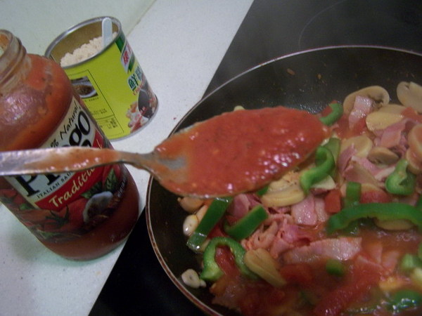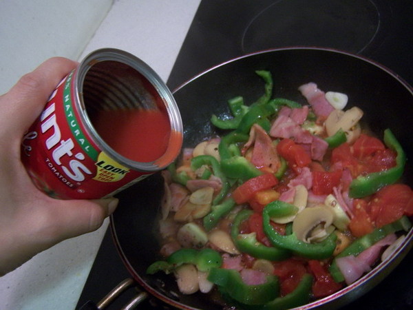 油還沒熱的時候就先下蒜頭跟黑胡椒粉炒香,油太熱會容易焦,接著就先放青椒跟培根,炒一炒再加入本來就已經熟的洋菇。然後我會倒一點Hunt’s蕃茄粒中的湯汁,讓麵吸湯汁,所以麵不可以太熟。