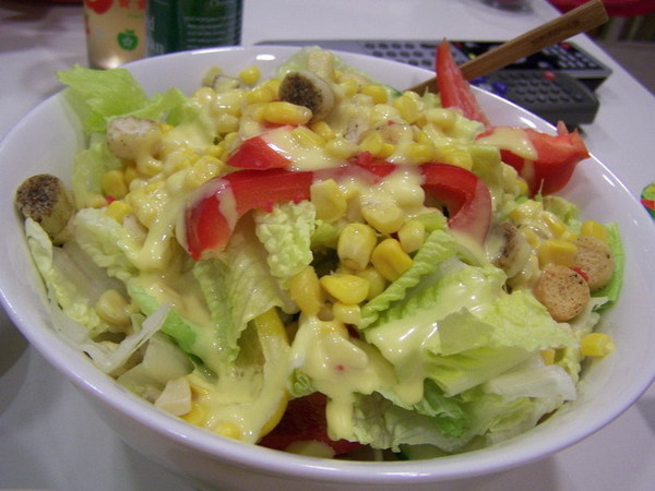 奧麗薇愛生菜,所以又準備了一大碗的蘿美生菜!加上烤麵包粒、玉米粒、彩椒、小黃瓜,還要黑胡椒粉跟起司粉,今天用的是蜂蜜芥末沙拉醬,我愛!