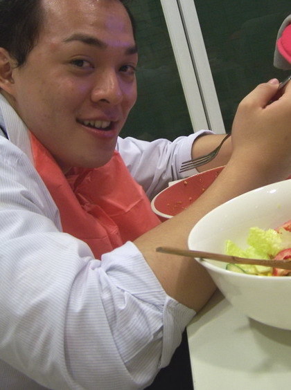 開動囉!光劍的主人必需吃掉一大盤的拿波里義大麵,而且圍上橘色的IKEA紙巾是怎樣呀!好吧!看在你穿白色衣服的份上!(已經跟你說我會將這張照片PO到部落格上喔!哈哈哈哈!)