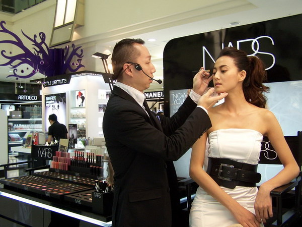 NARS彩妝師Gina正在幫消費者畫指甲油!她是一個我覺得畫了完整的眼妝,但戴眼鏡也遮不住風采的彩妝師!哈!