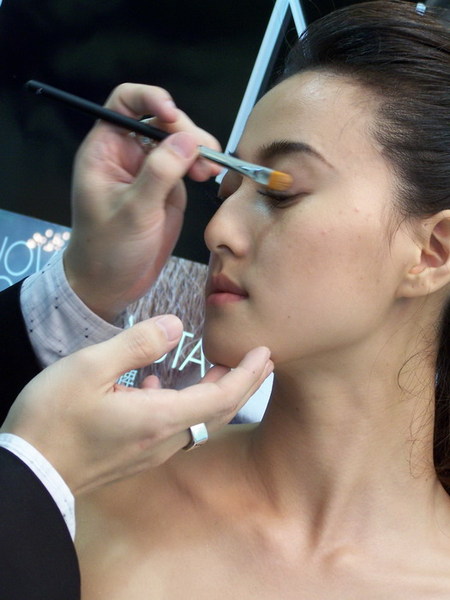 下午五點半的時候Dester老師會有一場彩妝示範秀,彩妝師Lewis正在幫模特兒先上簡單的底妝跟修容!Lewis刷睫毛的功力了得!我遠遠的就看到爆猛睫毛,而且不是假睫毛喔!