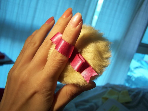 打開之後的小粉撲是咖啡色的,桃紅色的緞帶就跟外包裝盒一樣,拿著粉撲的手也變美了耶!而且輕拍在身上有“皮草”般的觸感說!