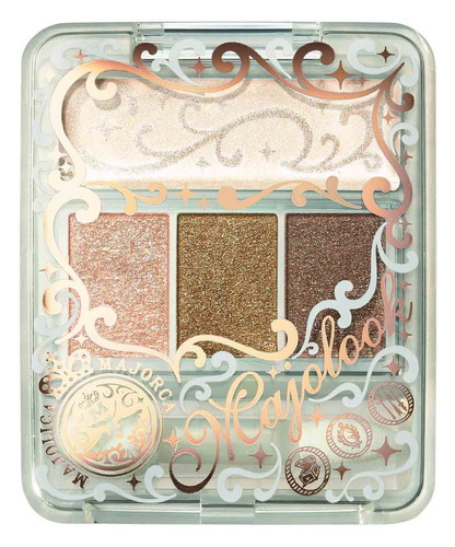 這就是魔女幻彩眼影盒/皮革玫瑰,有一點紫褐色的感覺,最喜歡它盒蓋上的設計,還有Majo look的可愛草寫體字樣,金光閃閃的燙金。