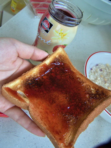 好久沒吃烤土司抹果醬了!因為我喜歡抹鹹奶油或顆粒花生醬!SCHWARTAU的香滑草莓香草果醬早就想要買了!但它完全沒有水果的顆粒,是給小孩吃的吧!因為還有推出海綿寶寶的草莓香蕉果醬喔!我也想要買!但這一款完全沒啥香草味啦!厚~但OK啦OK!