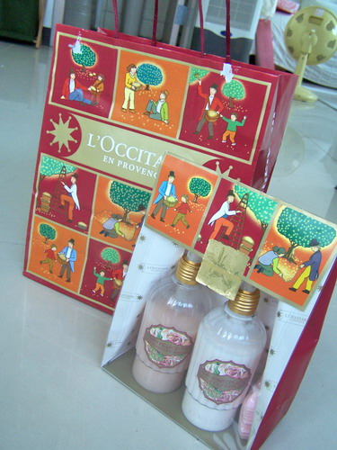 這段其間歐舒丹的包裝也跟著很耶誕,袋子跟平常都不一樣喔!我都會留著當平常的購物袋用,圖案很漂亮,裝著玫瑰洗潤髮品的小禮袋也很精美,裡面還有一塊蝴蝶形狀的香皂喔!